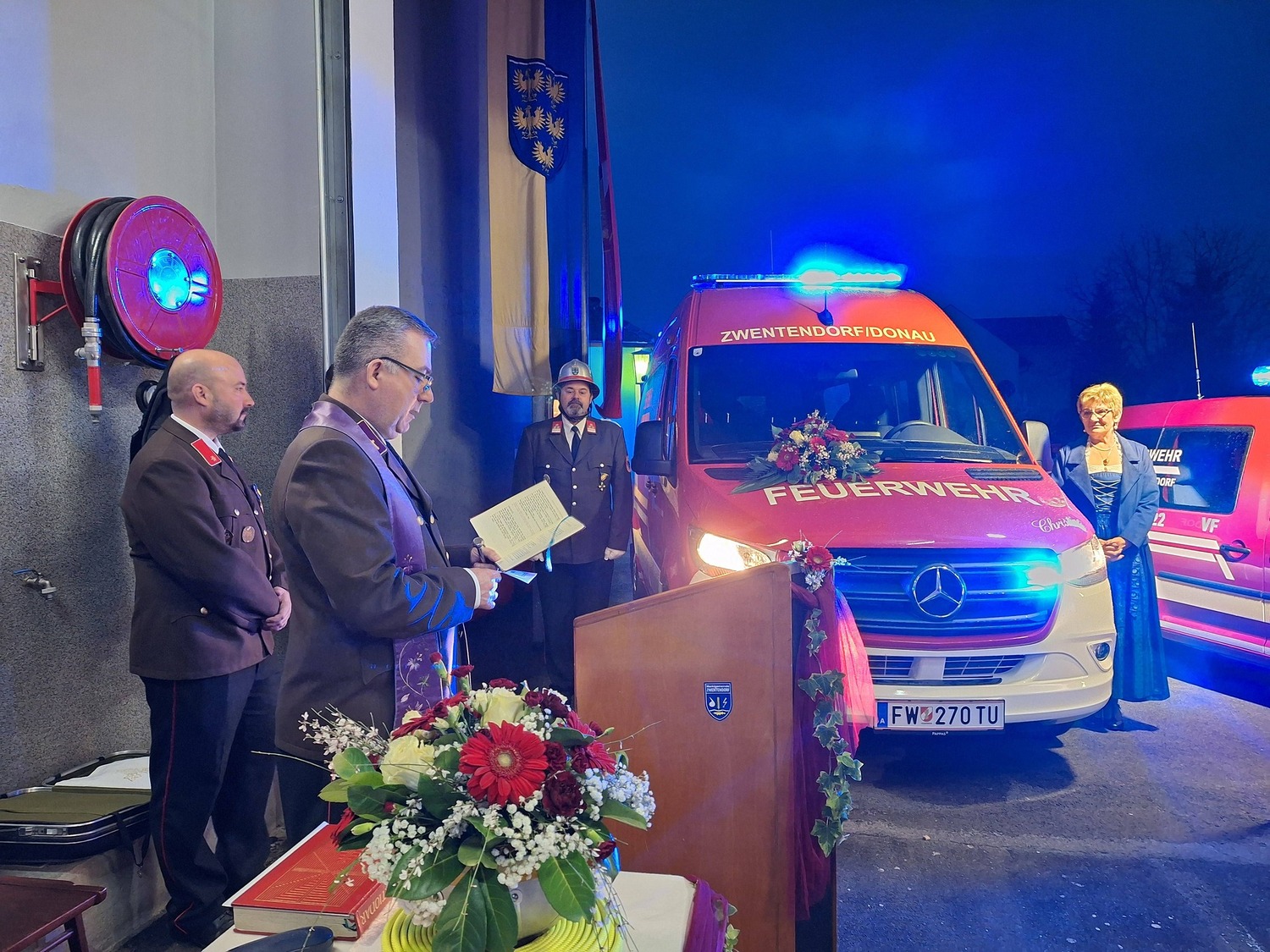 Ein Kommandofahrzeug und ein Versorgungsfahrzeug werden gesegnet, Patinnen sind Christine Popper und Edeltraud Haidinger.