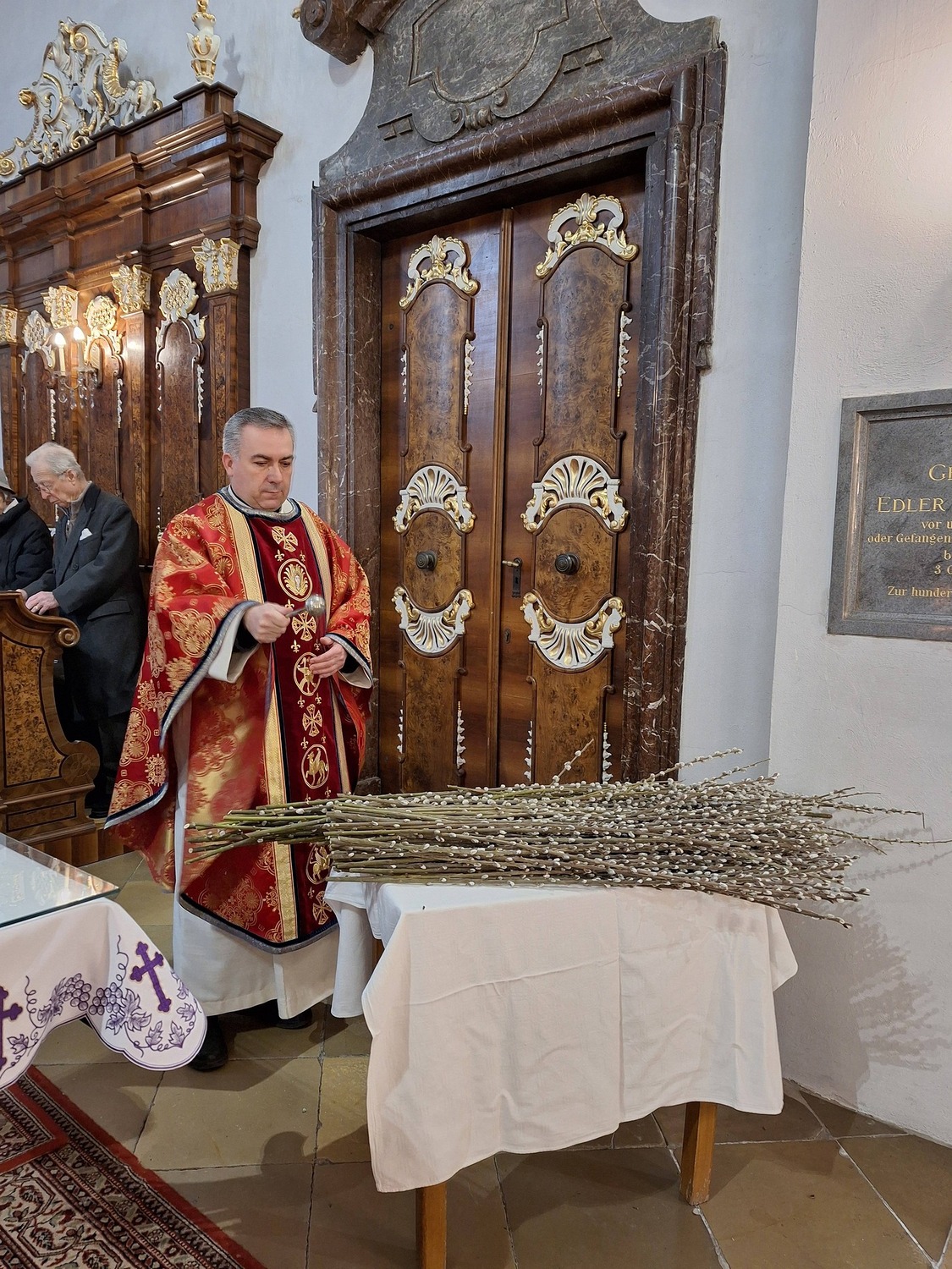 Zur Segnung der Palmbuschen der Ratschergruppen geht Pfarrer Sanocki zu den Kindern, die in den Arkaden der Mittelschule Schutz gesucht haben.