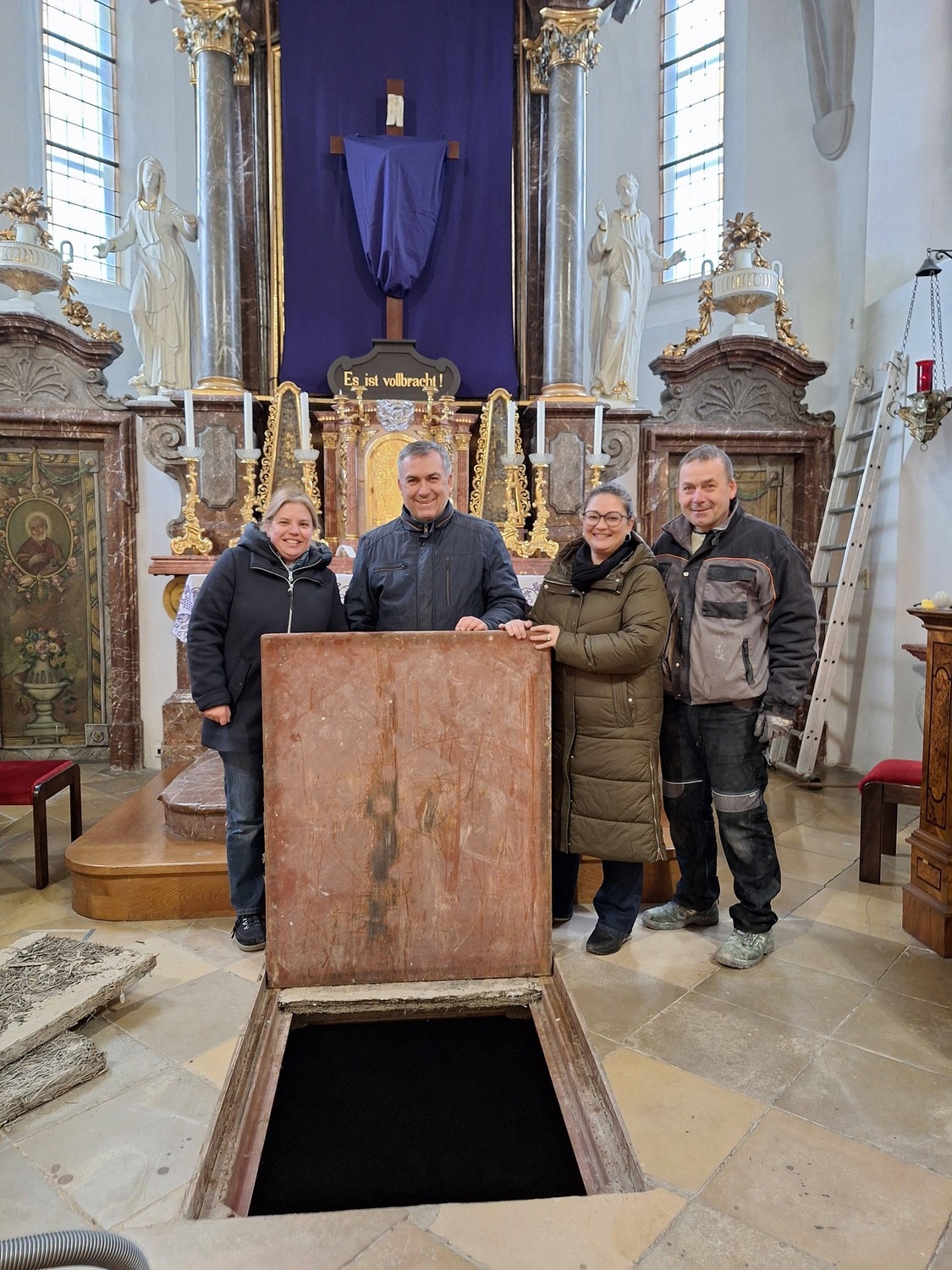 Öffnung der „Gruft“: Unter dem Presbyterium wurde laut Pfarrchronik 1952 eine Gruft mit sterblichen Überresten entdeckt.